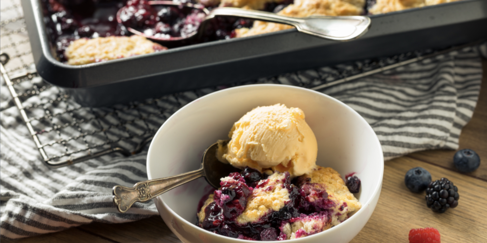 - Generous helping, top with assorted berries and a scoop of great quality of ice cream or clotted cream even.